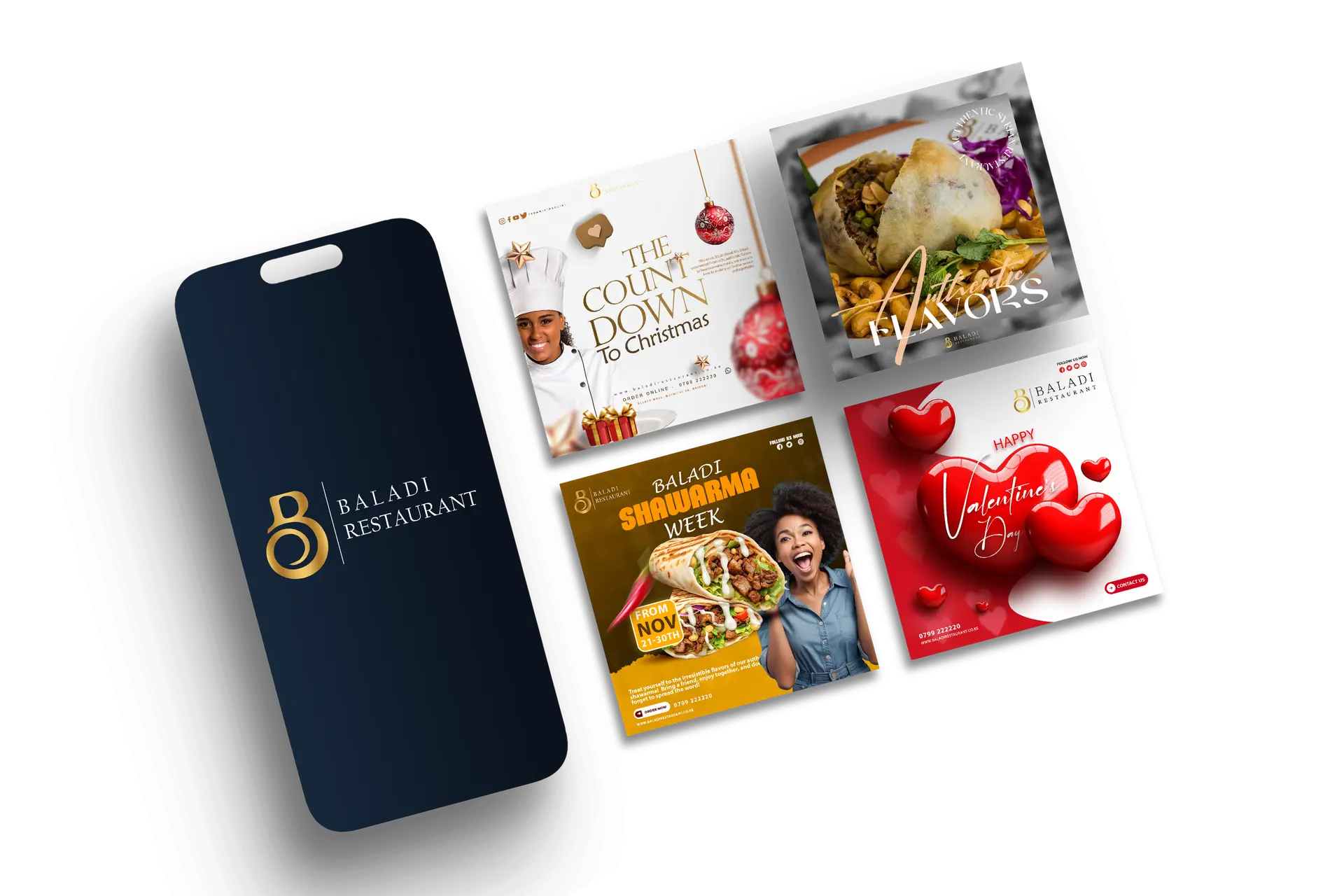 For Baladi Restaurant, I spearheaded the development of their brand identity, crafting a distinctive logo and visual language that authentically reflected their unique culinary offerings and vibrant atmosphere. This included the creation of a cohesive brand guide to ensure consistency across all marketing materials.